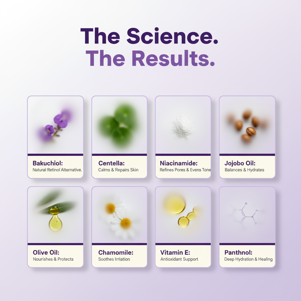 Bakuchiol helps support collagen production, smooths fine lines, evens out skin tone, and improves texture. It also has antioxidant and anti-inflammatory properties, which help protect the skin from environmental stress. Because it is gentle, it works for most skin types, including sensitive skin.